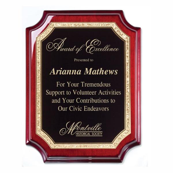 This exquisite plaque is made of a beautiful Rosewood Piano Finish and is designed with great precision. It features a stunning hand-rubbed finish, which accentuates the natural elegance of the wood. The notched corners and curved sides lend an extra touch of sophistication to the plaque, making it an excellent choice for any company or organization that wants to honor a remarkable individual. The plaque can be fully customized with a laser-engraved black metal plate. This meticulously crafted plaque is sure to impress and will be cherished for many years to come.