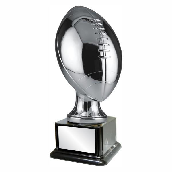 Solid resin with faux marble finish base This life-sized chrome football on a faux marble-finished base is perfect for champions or fantasy football league winners.