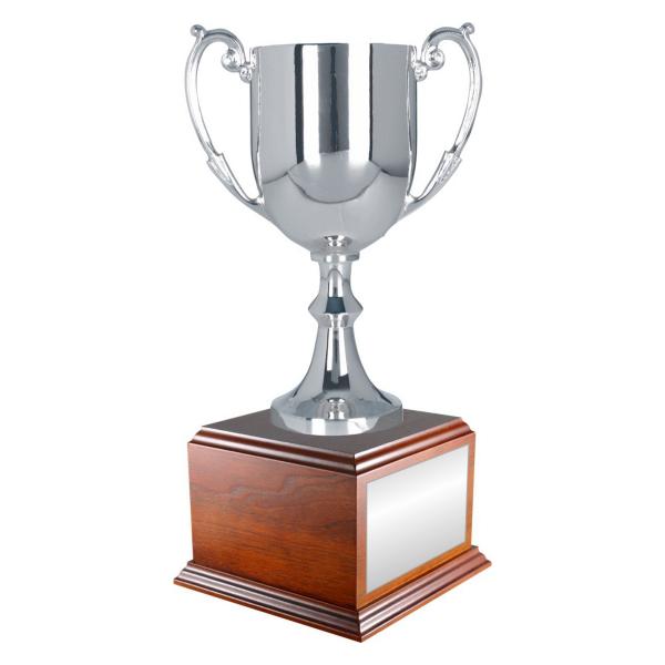 This exquisite Bellissimo trophy is made of polished silver metal and boasts a walnut veneer base at the bottom that can hold a silver-tone engraved plate. It is a great way to honor and acknowledge the hard work and dedication of those who deserve it.