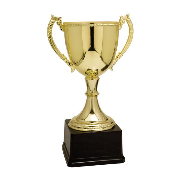 This exquisite cup boasts a sleek, gold finish metal body and handles that lend it an air of elegance. The cup is affixed to a sturdy metal stem that culminates in a heavy weighted base, rendering it stable and sturdy. The base can be customized with an engraved plate, allowing you to personalize it and pay tribute to the deserving winner.