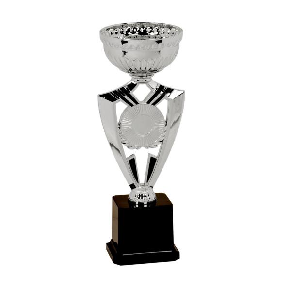 The Silver Finish Ribbon Cup is an award that features a metal cup at the top and is attached to a sturdy plastic ribbon riser that culminates in a heavy weighted base. This makes it stable and sturdy. The base can be customized with an engraved plate, which allows you to personalize it and pay homage to the deserving winner. In addition, the ribbon can have a 2" disc engraved with your favorite logo or artwork.