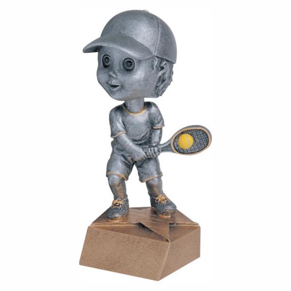 Bobblehead tennis trophies are the most adorable tennis awards you can get! Our tennis bobble trophies are made of resin and feature heads that wiggle and shake, bringing joy and laughter to your youngest tennis players. We also have bobblehead trophies for your coaches and team moms. Each bobblehead tennis trophy comes with a personalized engraving plate.