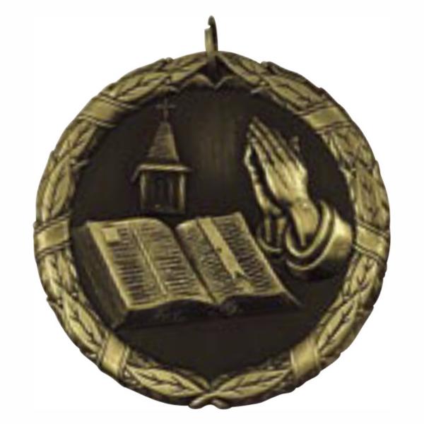 Looking for the perfect religious award to honor your champion? Look no further than this 3-dimensional medal, available in gold, silver, or bronze colors. Measuring 2" in diameter, it's just the right size. You can also choose from a selection of neck ribbons, including red, white, and blue, solid red, solid white, or solid blue.