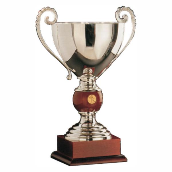 This exquisite trophy is made of silver-plated metal and boasts a high-gloss mahogany base at the bottom that can hold a silver-tone engraved plate. In the middle of the trophy, there is a round mahogany sphere that holds a gold coin. The trophy is ideal for congratulating any team, be it a business team for meeting their goals or a sports team for winning the championship. It is truly a magnificent piece of art that will leave a lasting impression.