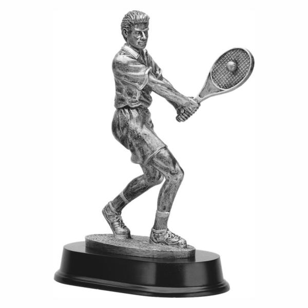 Pewter with gold accents. Celebrate your success in tennis with this Male Tennis Resin trophy. This hand-crafted, 10" figurine is made of pewter-finished resin and features gold highlights, making it a unique addition to your upcoming tennis tournament. The figurine depicts a lifelike Male Tennis player, and it is placed on an elegant base that comes with a personalization plate.