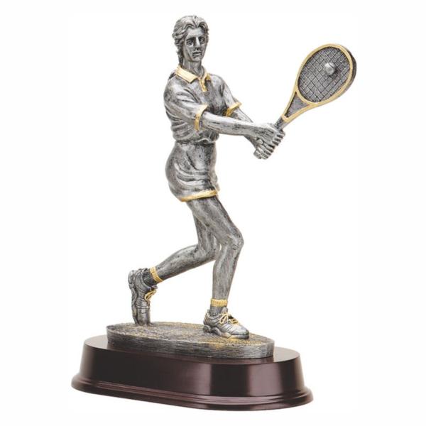 Pewter with gold accents. Celebrate your success in tennis with this Female Tennis Resin trophy. This hand-crafted, 10" figurine is made of pewter-finished resin and features gold highlights, making it a unique addition to your upcoming tennis tournament. The figurine depicts a lifelike Female Tennis player, and it is placed on an elegant base that comes with a personalization plate.
